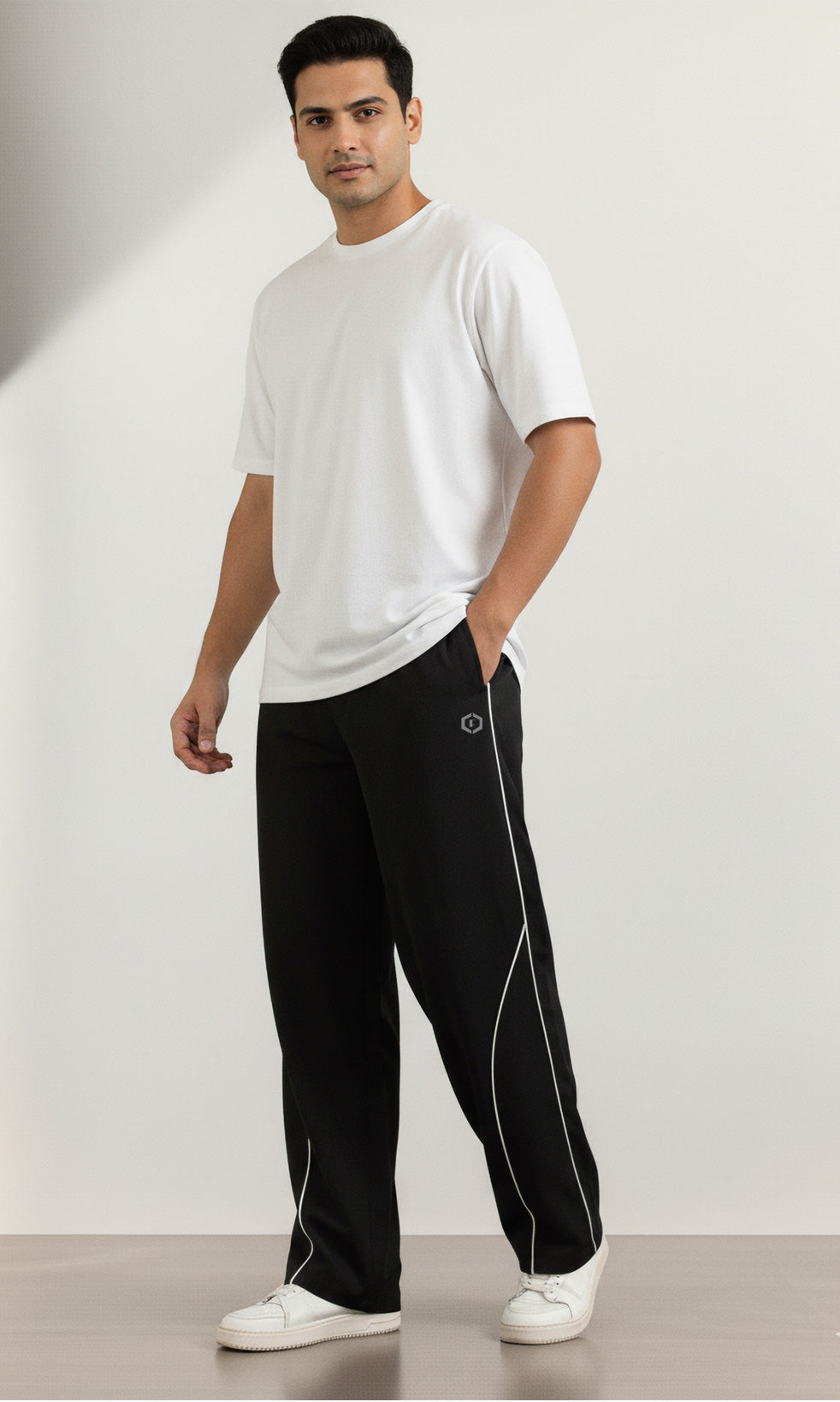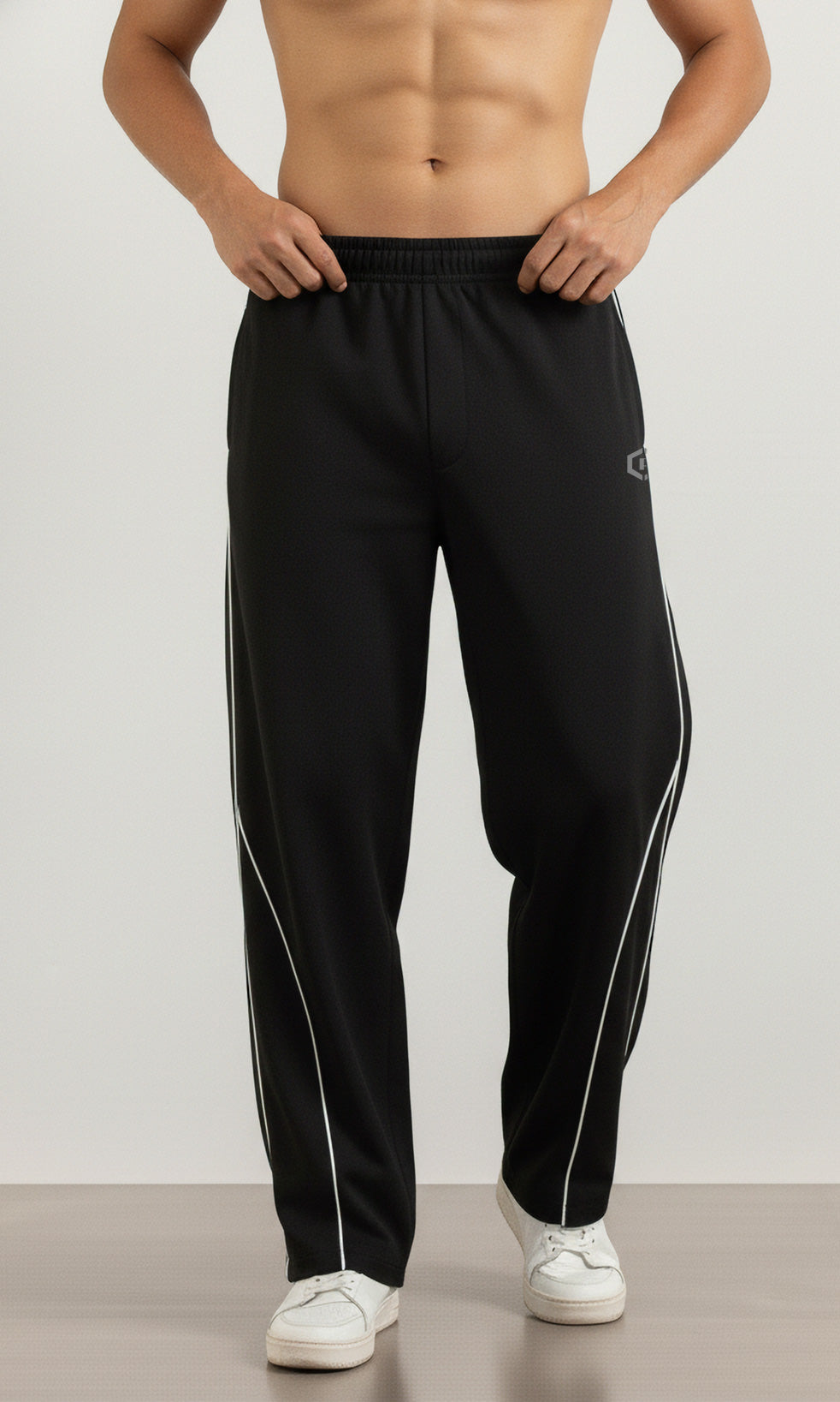 Cotton Blend Men's Track Baggy Pants Black With Mid White Side & Front Pipen