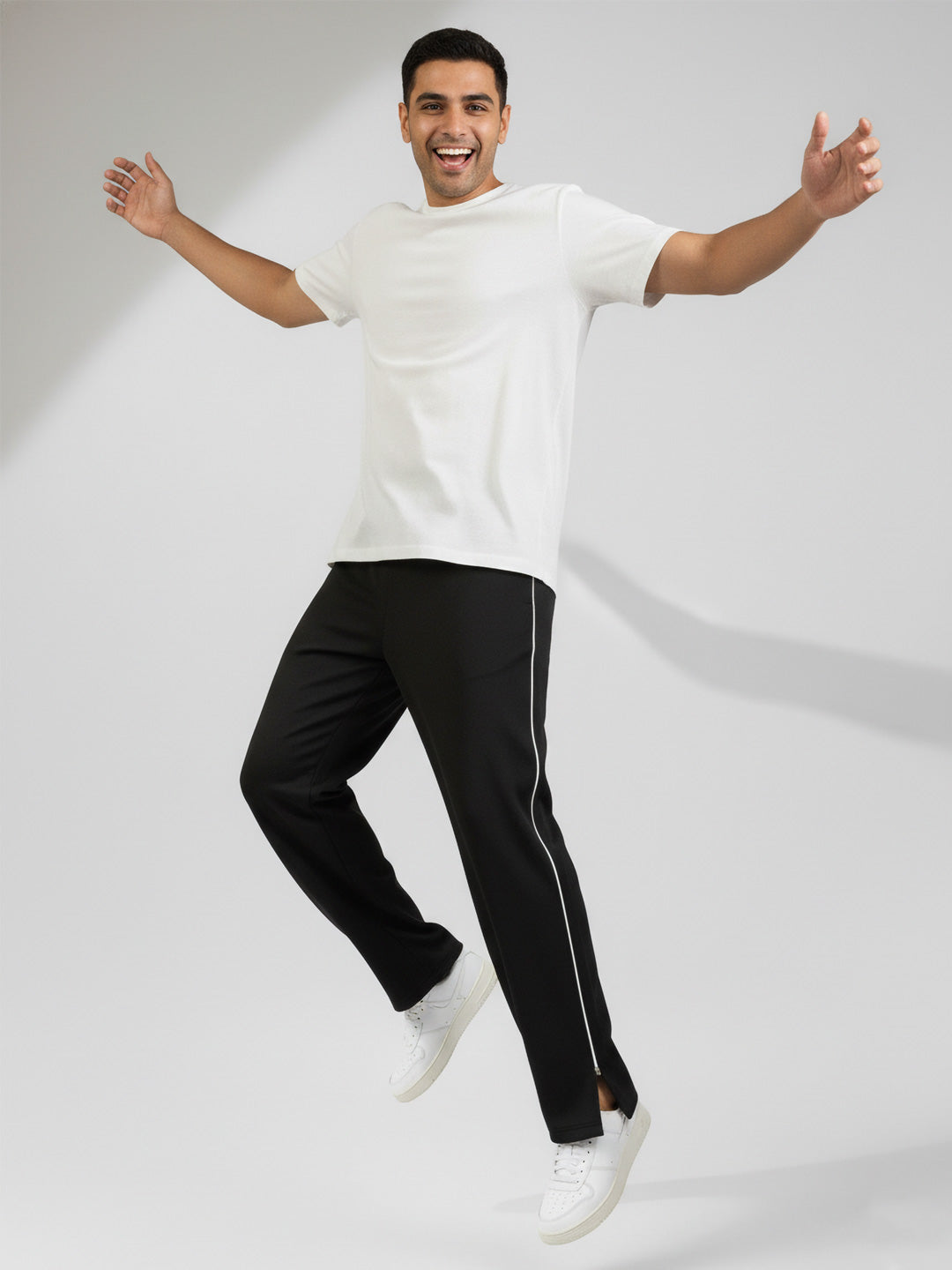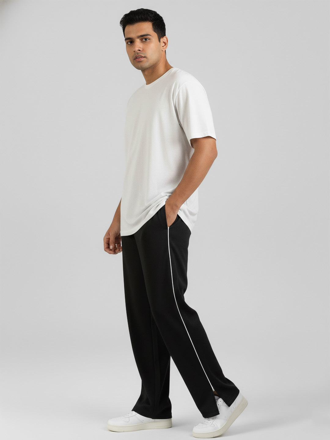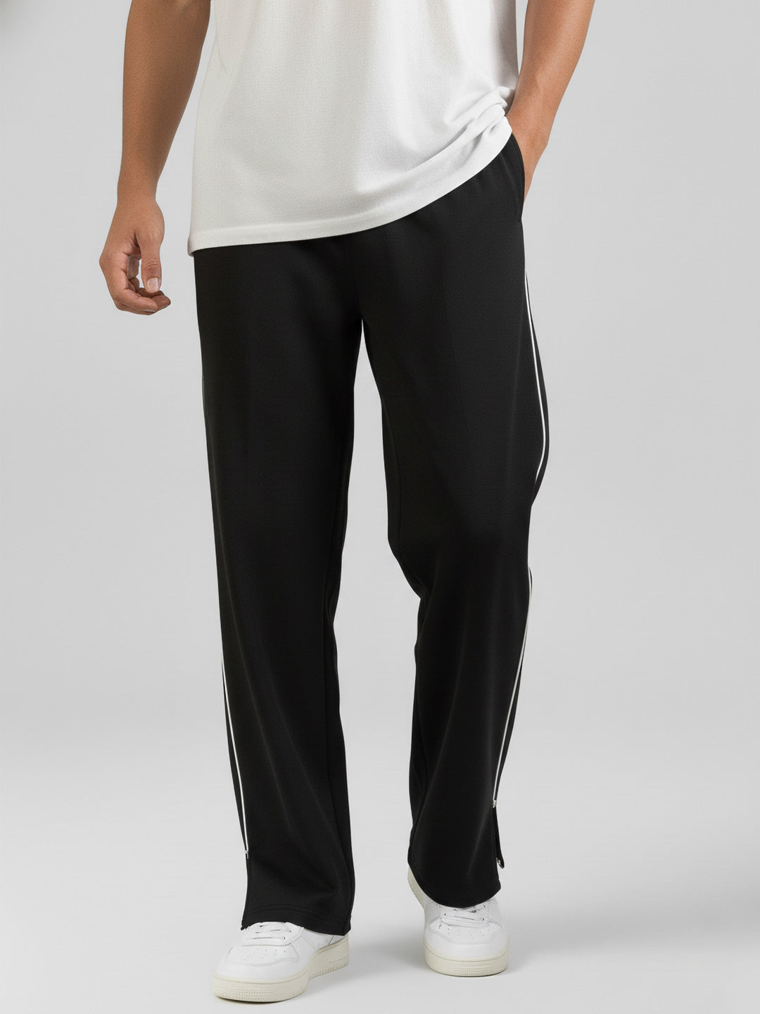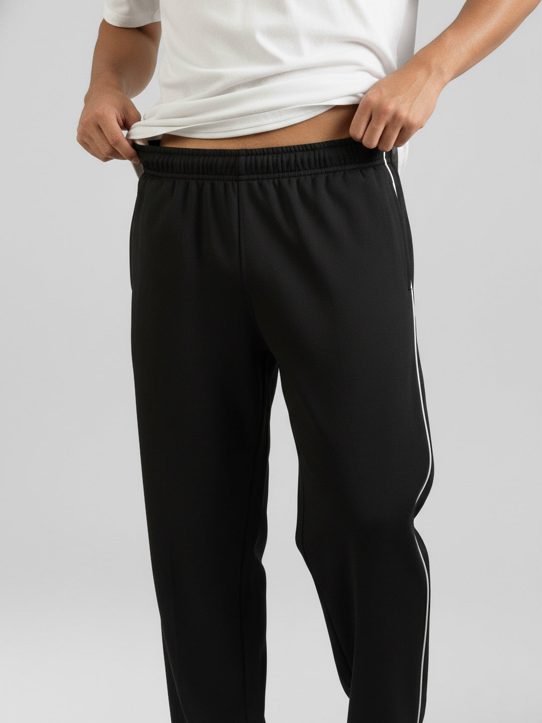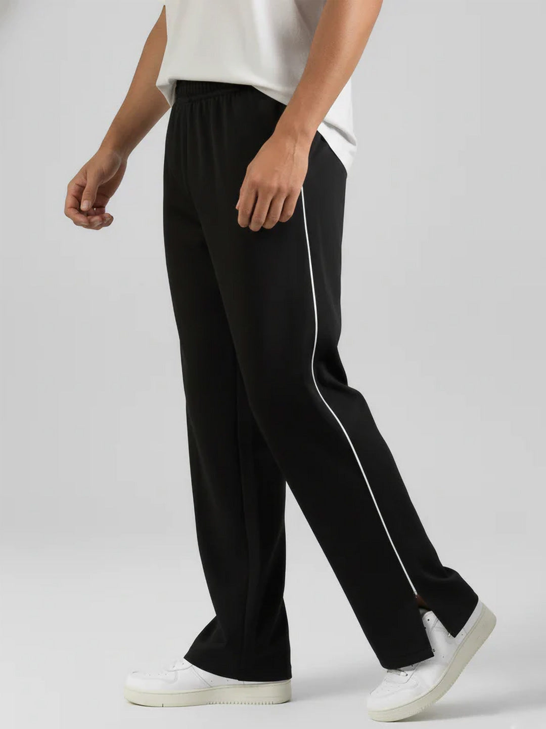 Crafted from a resilient poly-cotton terry blend, these baggy track pants balance durability with everyday wearability. The generously cut silhouette accommodates full range of motion, making them equally suited for athletic training, casual wear, or layered styling. The breathable fabric composition regulates temperature during physical activity while remaining lightweight enough for extended wear without constraint. Black base with contrasting mid-white side delivers understated sophistication and effortless versatility across multiple wardrobe combinations. It has elastic waist abdn with hidden drawstrings to provide maximum comfort.