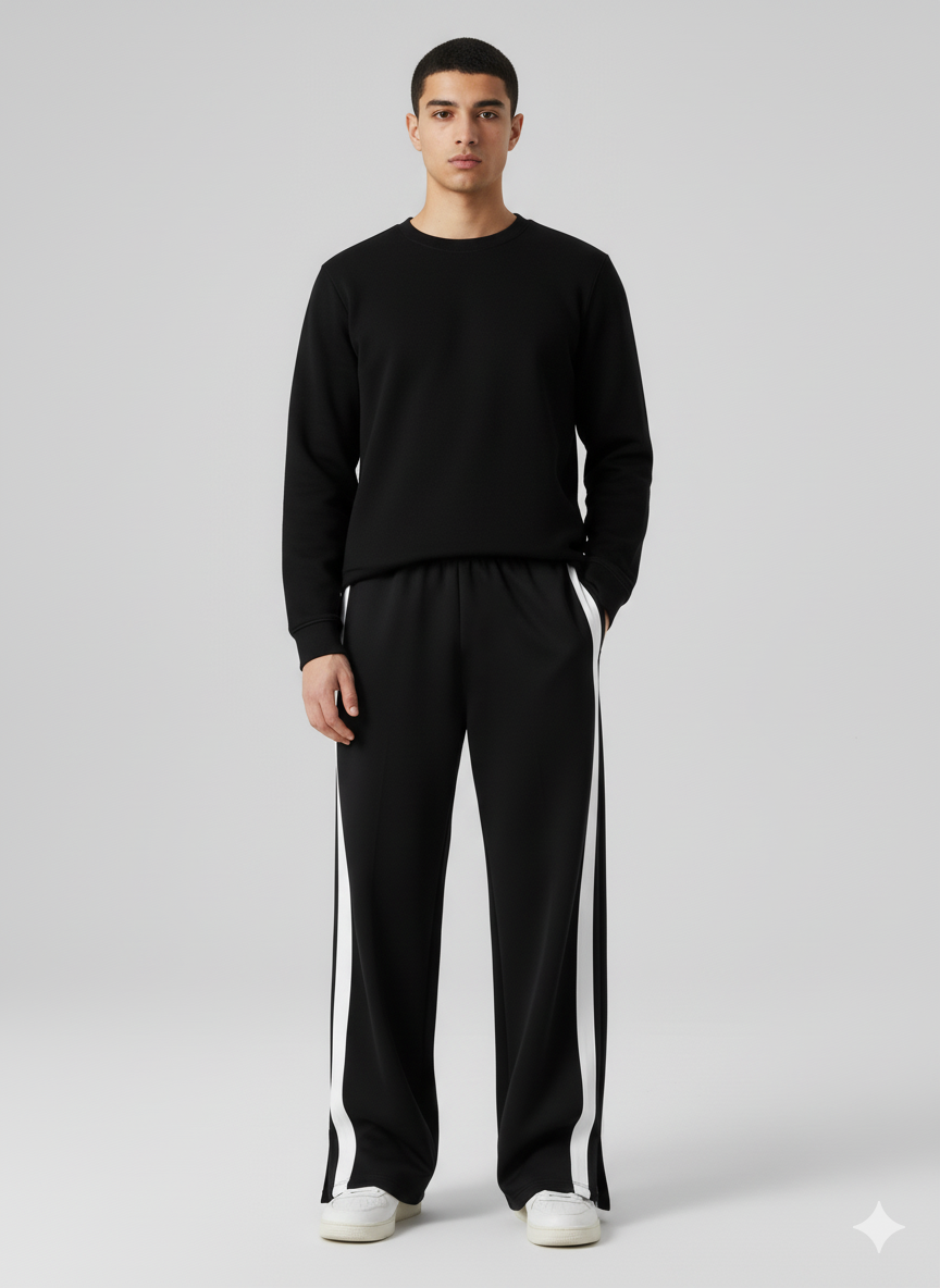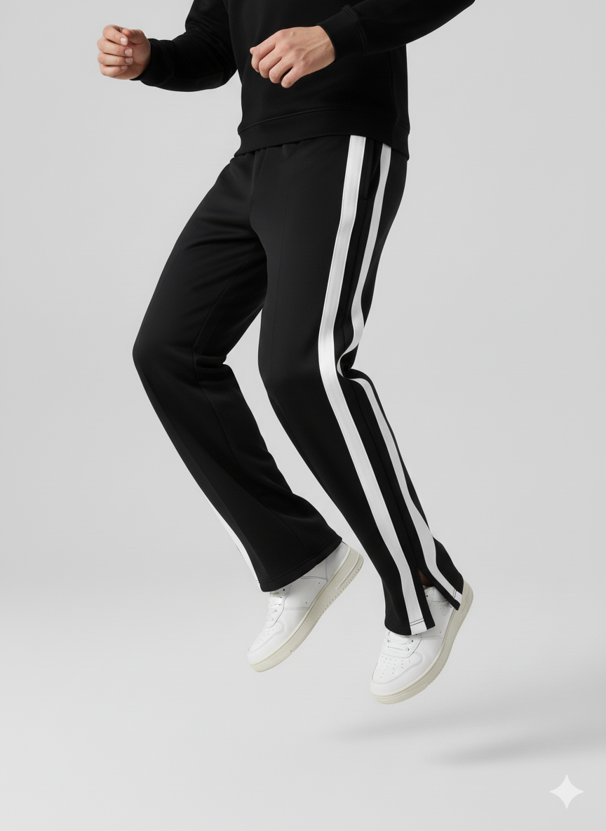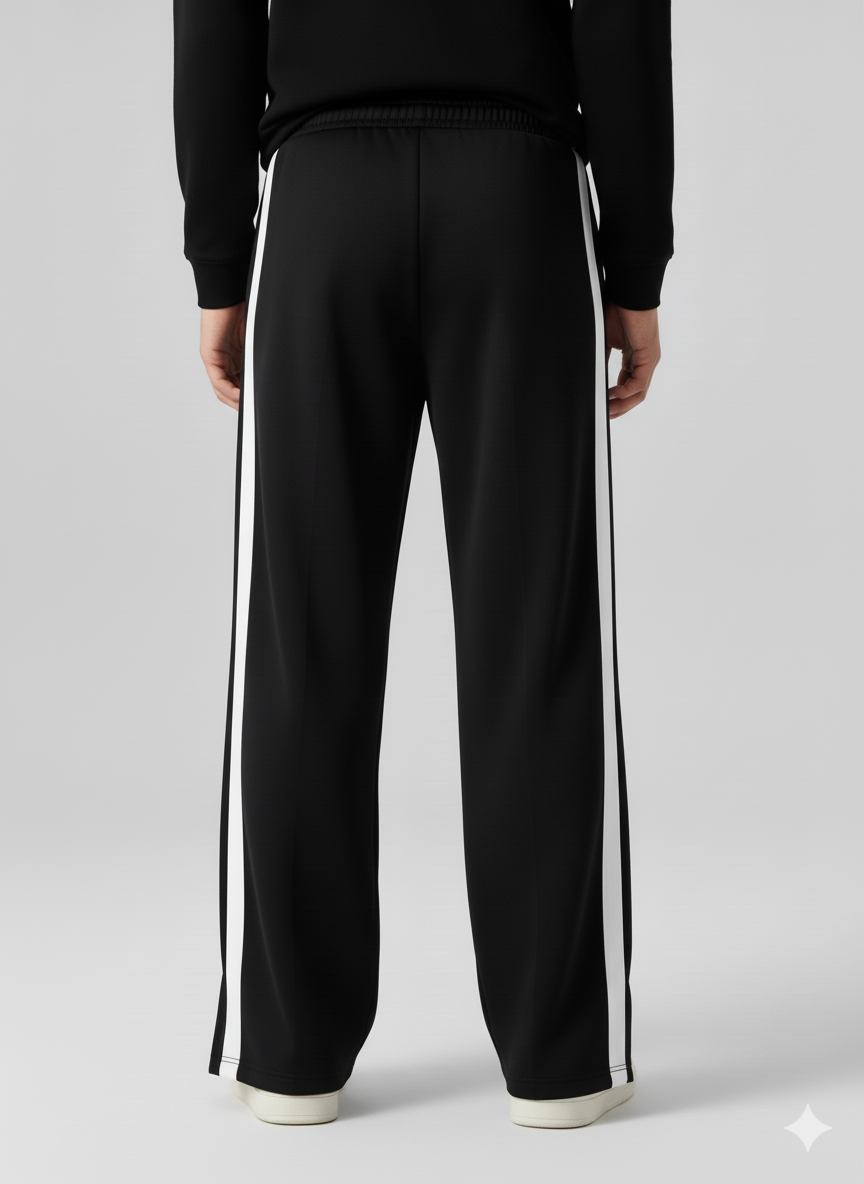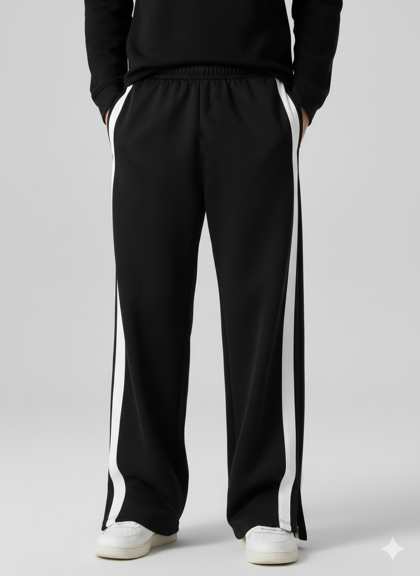 Crafted from premium poly-cotton blend fabric at 180 GSM, these baggy track pants deliver exceptional comfort and versatility. The relaxed silhouette and soft construction make them equally suited for casual outings, formal settings, or everyday wear. Their lightweight design and breathable material perform exceptionally well during workouts and gym sessions. The classic black colorway with mid-white stripes pairs effortlessly with vests and t-shirts, offering a contemporary aesthetic. Whether you're seeking functional athletic wear or stylish casual apparel, these pants combine durability with modern design sensibilities.