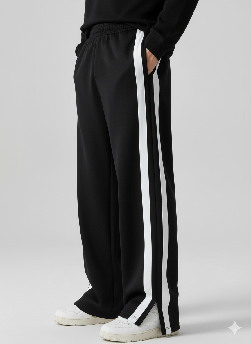 Crafted from premium poly-cotton blend fabric at 240 GSM terry french fabric, these baggy track pants deliver exceptional comfort and versatility. The relaxed silhouette and soft construction make them equally suited for casual outings, formal settings, or everyday wear. Their lightweight design and breathable material perform exceptionally well during workouts and gym sessions. The classic black colorway with mid-white stripes pairs effortlessly with vests and t-shirts, offering a contemporary aesthetic. Whether you're seeking functional athletic wear or stylish casual apparel, these pants combine durability with modern design sensibilities. It has elastic waist abdn with hidden drawstrings to provide maximum comfort.
