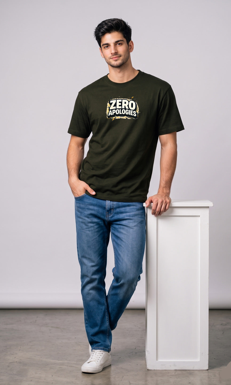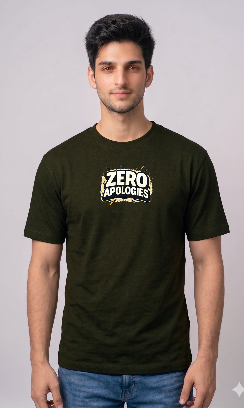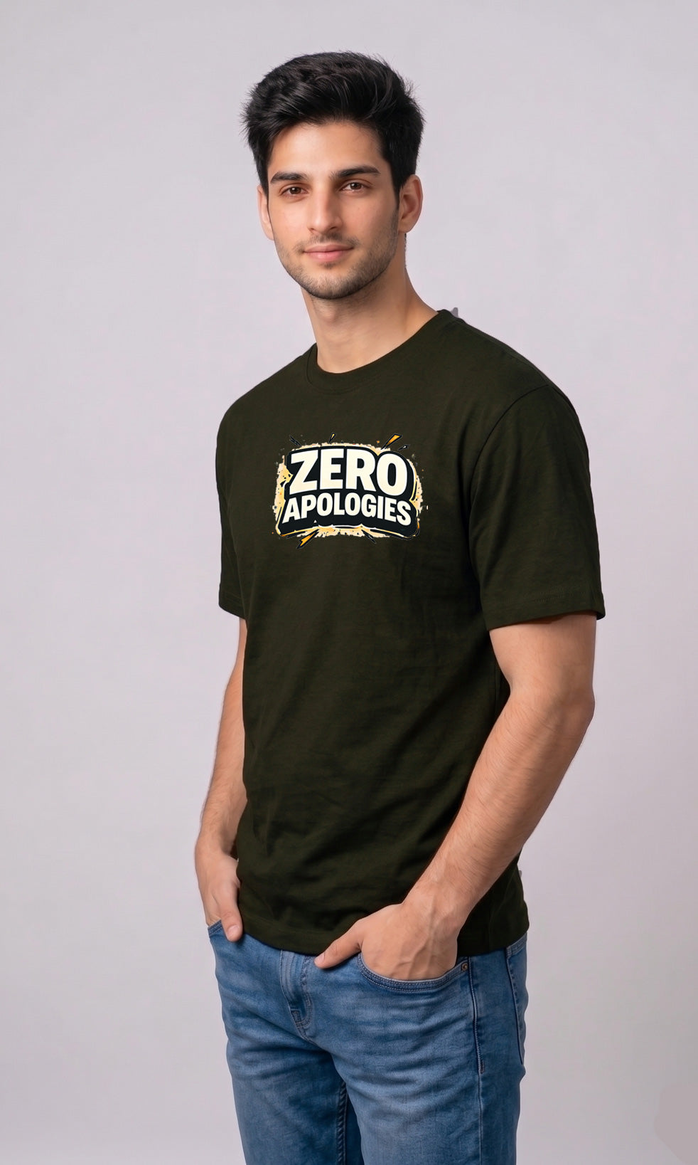 Upgrade your everyday wardrobe with the Febue “Zero Apologies” Olive Green Printed T-Shirt for Men, designed for those who believe confidence comes with kindness. Featuring a bold, eye-catching graphic print, this t-shirt blends modern streetwear aesthetics with a meaningful message.