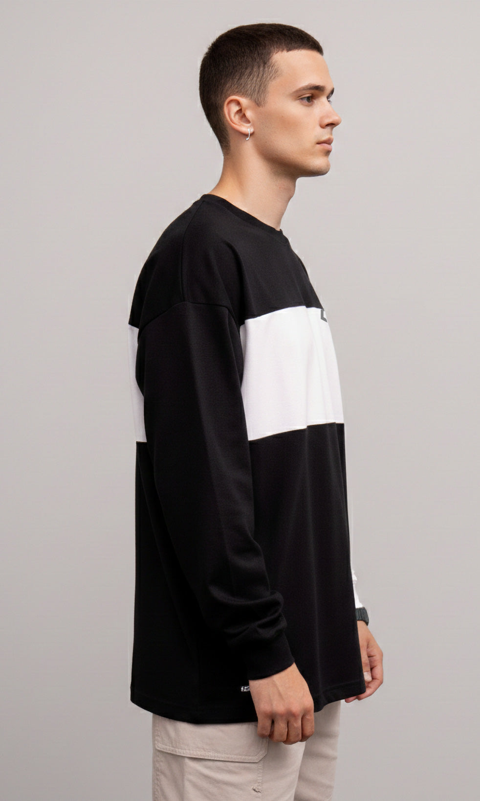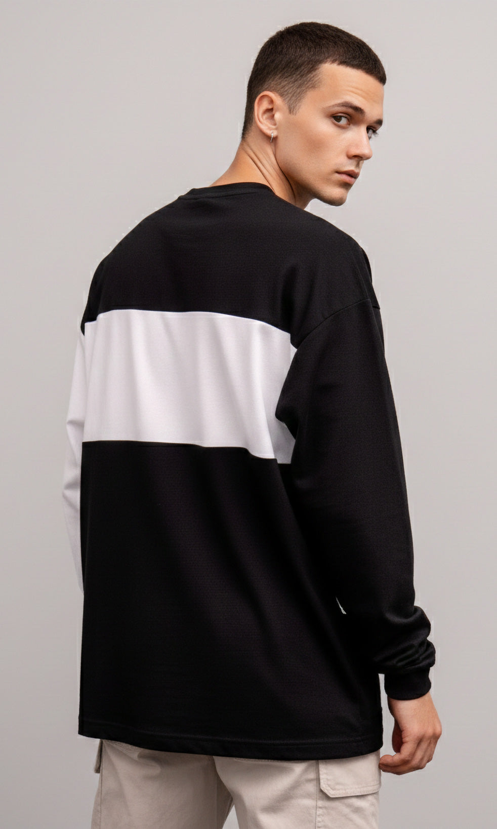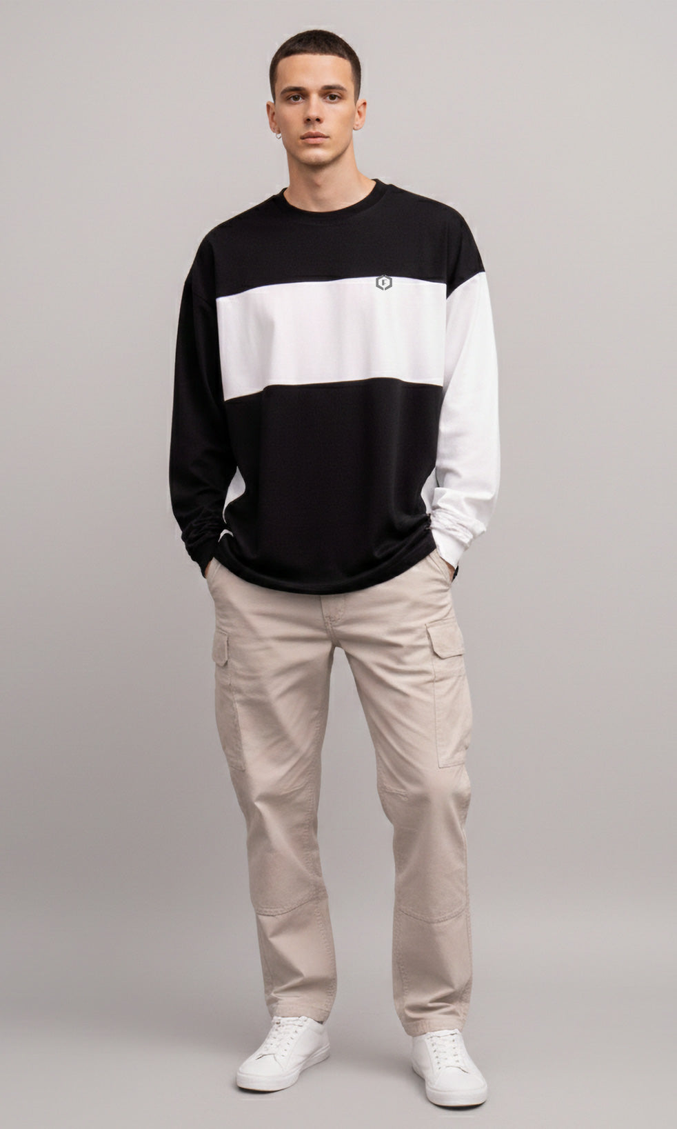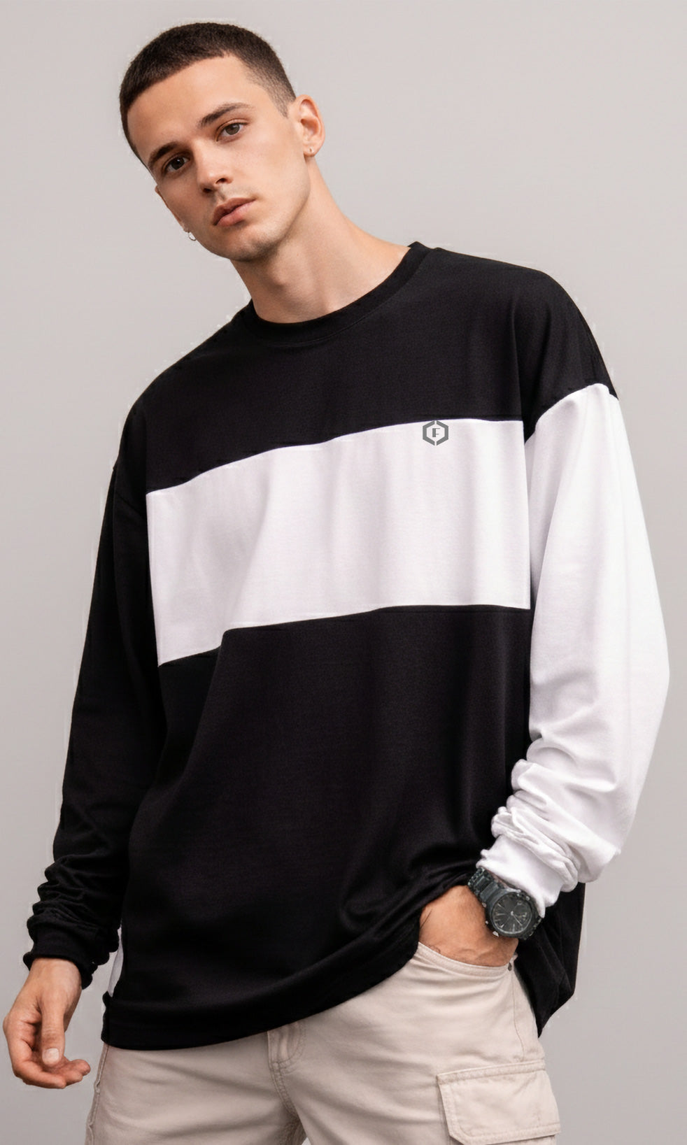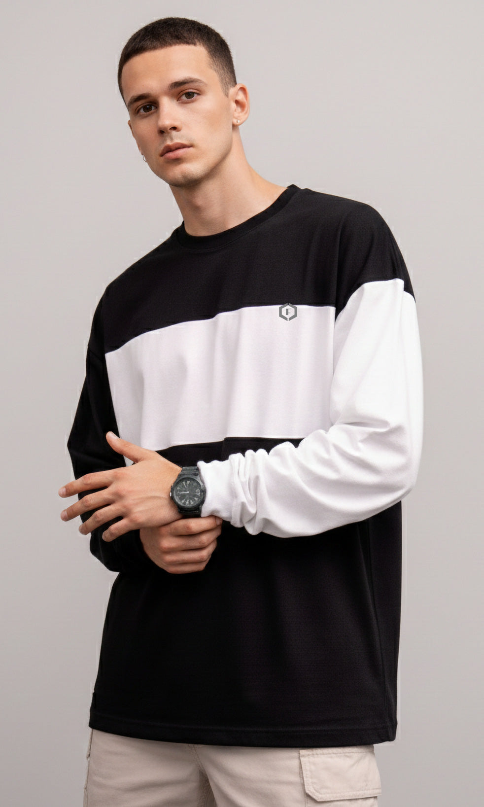 Make a bold streetwear statement with this super oversized baggy colorblock full sleeve T-shirt from the Febue collection. Designed for a relaxed, urban look, this tee features a striking dual-tone sleeve style with one arm in black and the other in white, creating a strong visual contrast that stands out effortlessly. The extra-loose, baggy fit gives a modern Korean streetwear vibe while ensuring all-day comfort and easy movement.