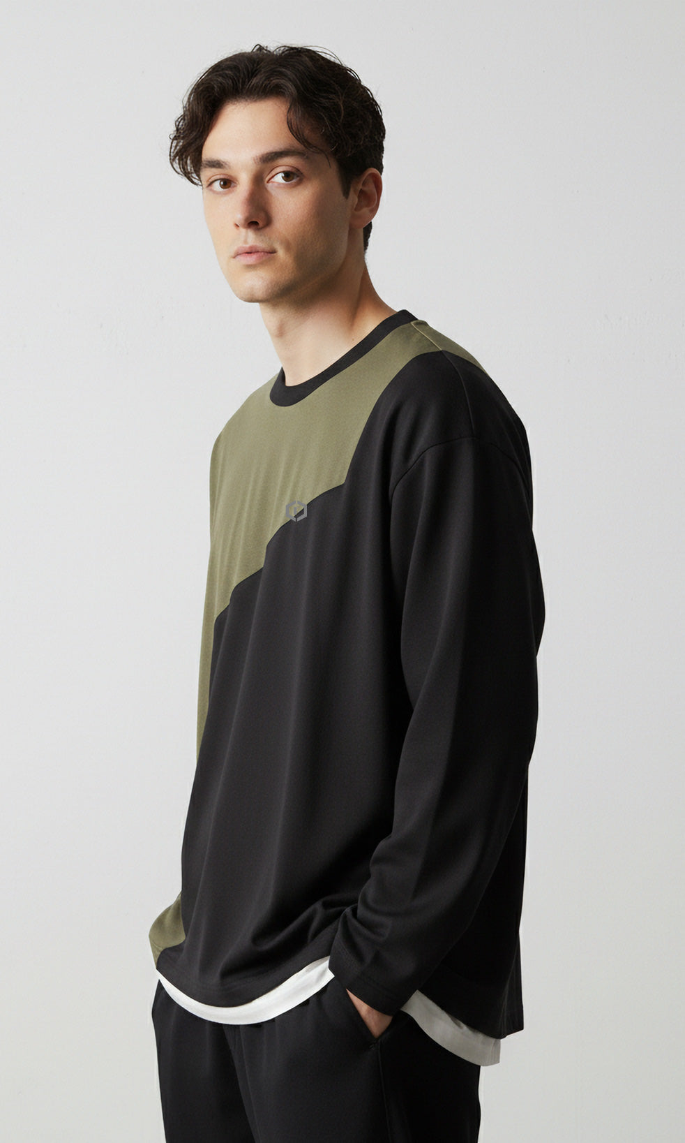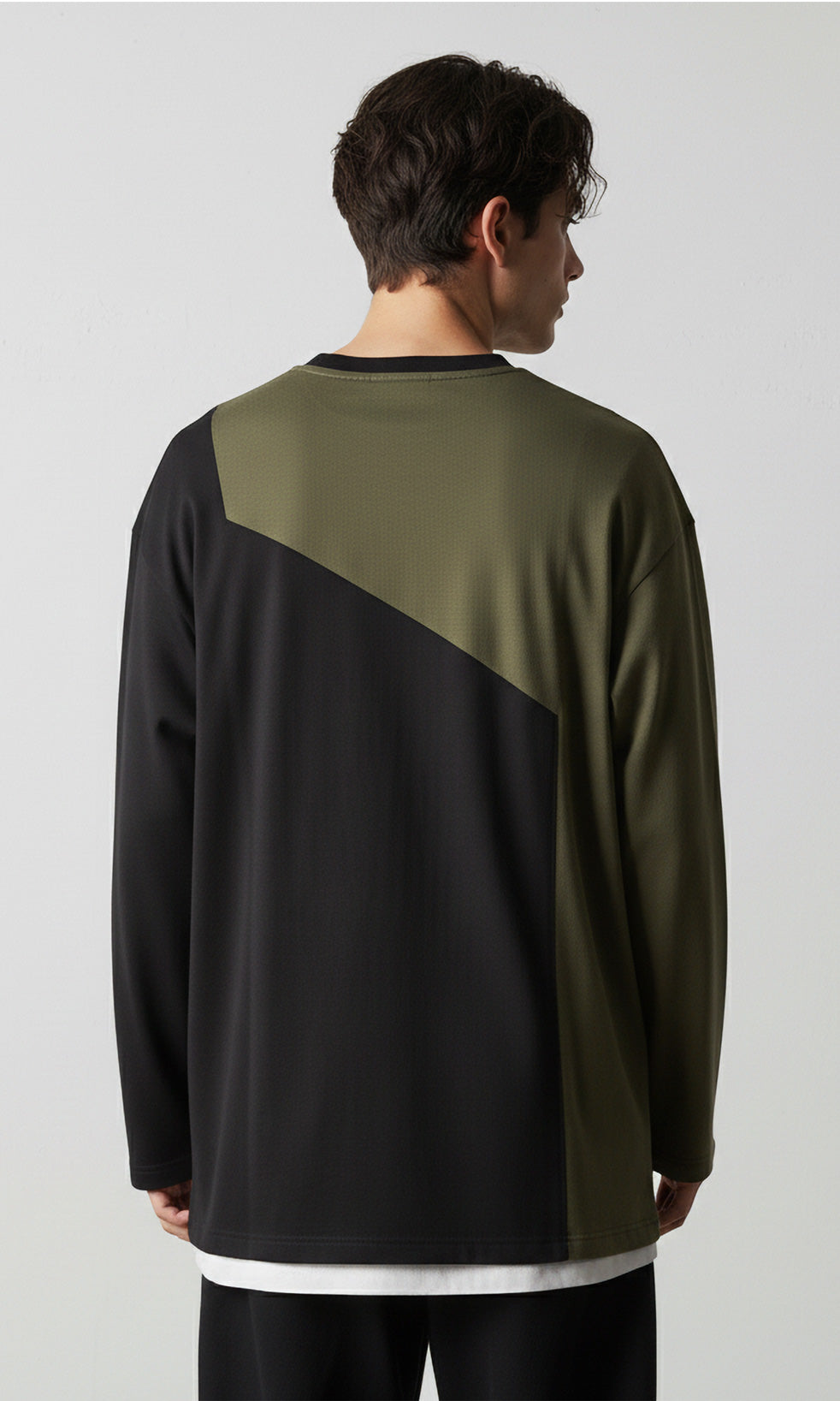 The olive green and black with white hemline color-block design adds a bold yet minimal street aesthetic, making this oversized full-sleeve t-shirt a standout piece in any modern wardrobe. The baggy oversized fit offers relaxed comfort and effortless style—perfect for street fashion, casual outings, or everyday wear.