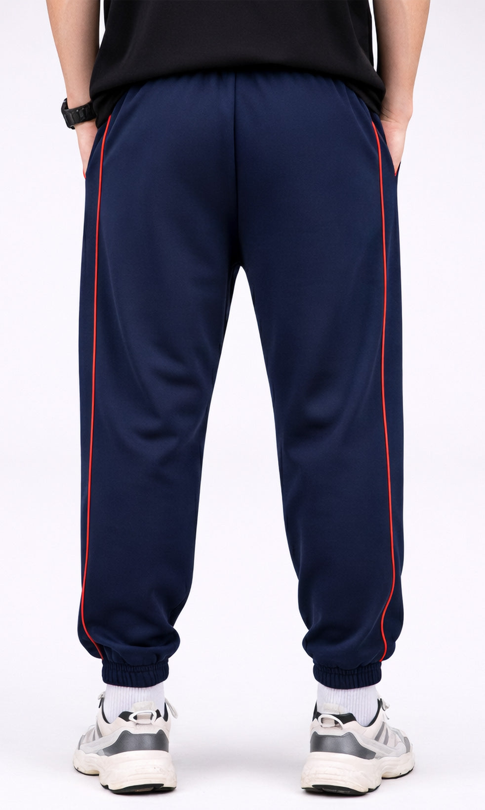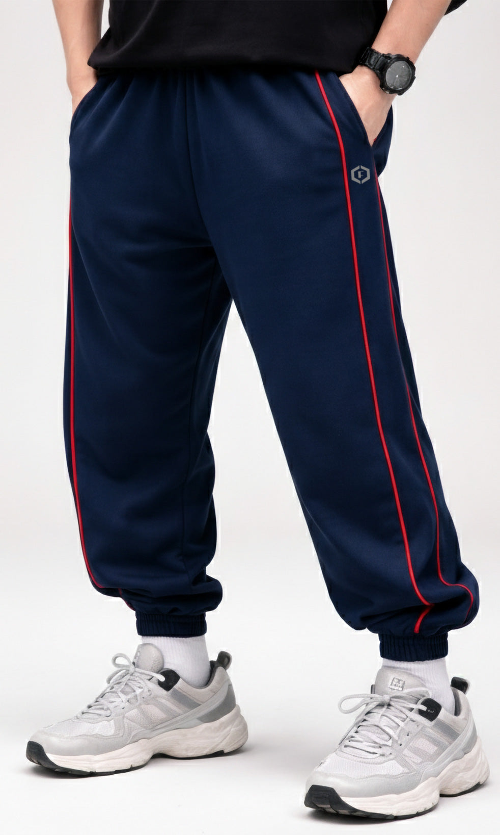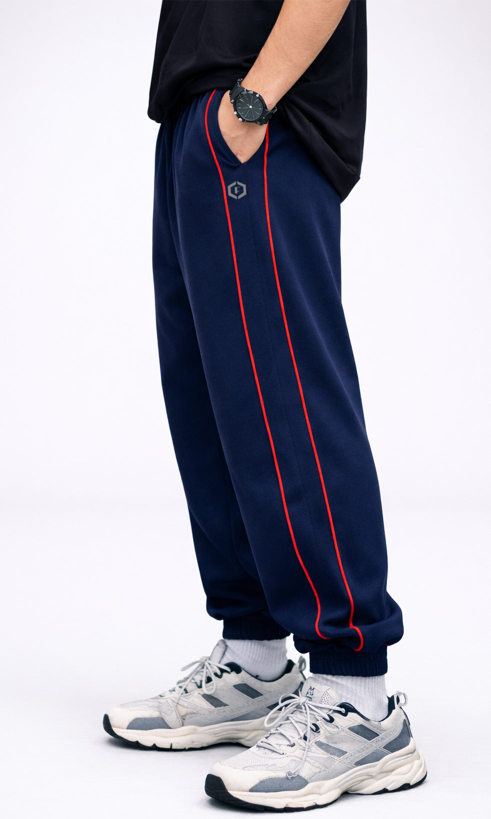 These men's navy joggers combine performance and style with a 240 GSM French terry construction that delivers lasting comfort and breathability. The athletic fit accommodates movement while maintaining a contemporary street aesthetic, enhanced by contrasting red side piping and finished elasticated cuffs. Versatile across gym sessions, casual wear, and athleisure contexts, they provide the relaxed silhouette and functional flexibility demanded by modern menswear.