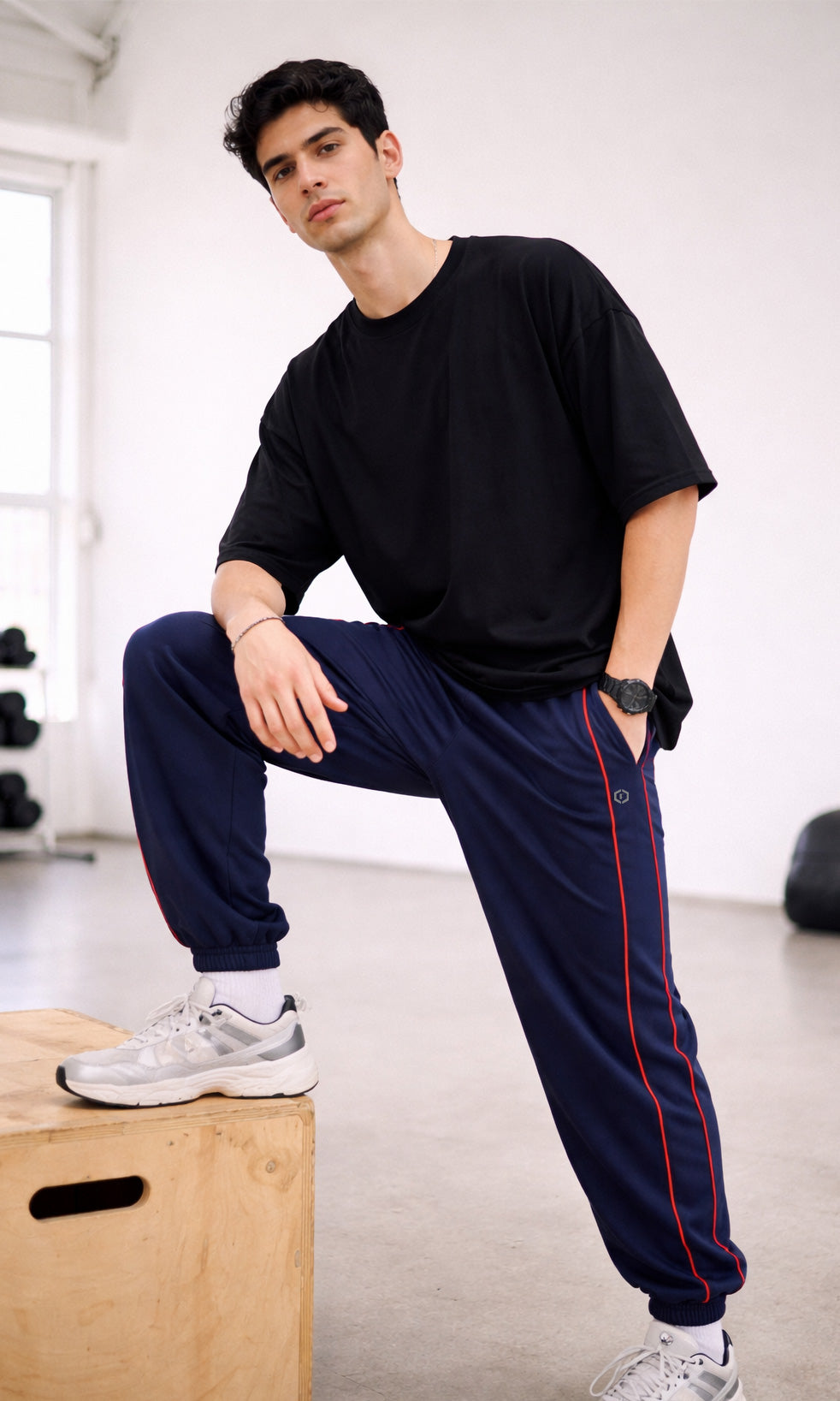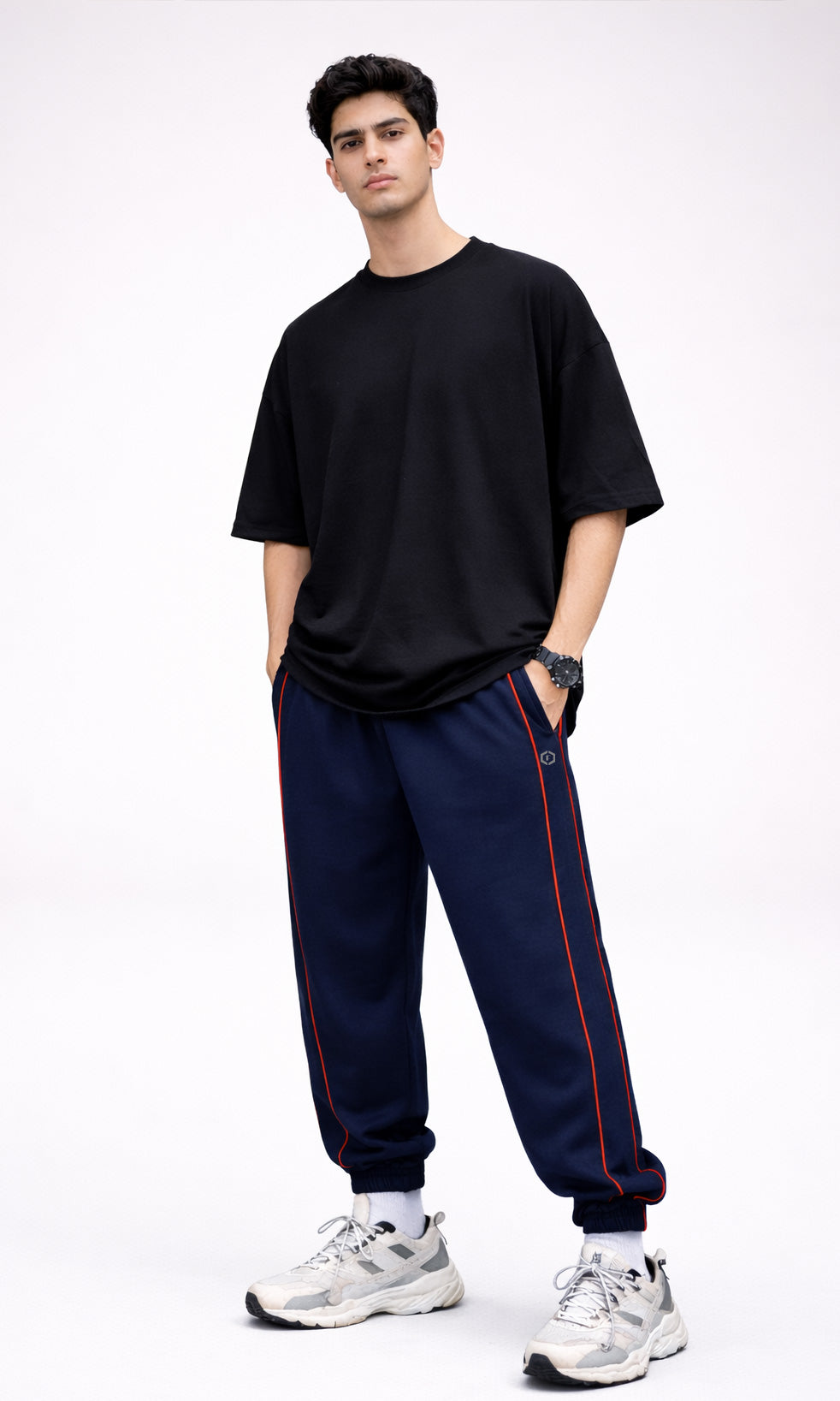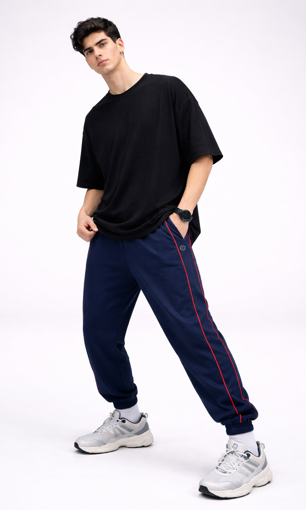 These men's navy joggers combine performance and style with a 240 GSM French terry construction that delivers lasting comfort and breathability. The athletic fit accommodates movement while maintaining a contemporary street aesthetic, enhanced by contrasting red side piping and finished elasticated cuffs. Versatile across gym sessions, casual wear, and athleisure contexts, they provide the relaxed silhouette and functional flexibility demanded by modern menswear.