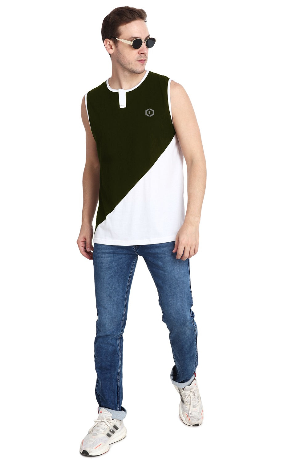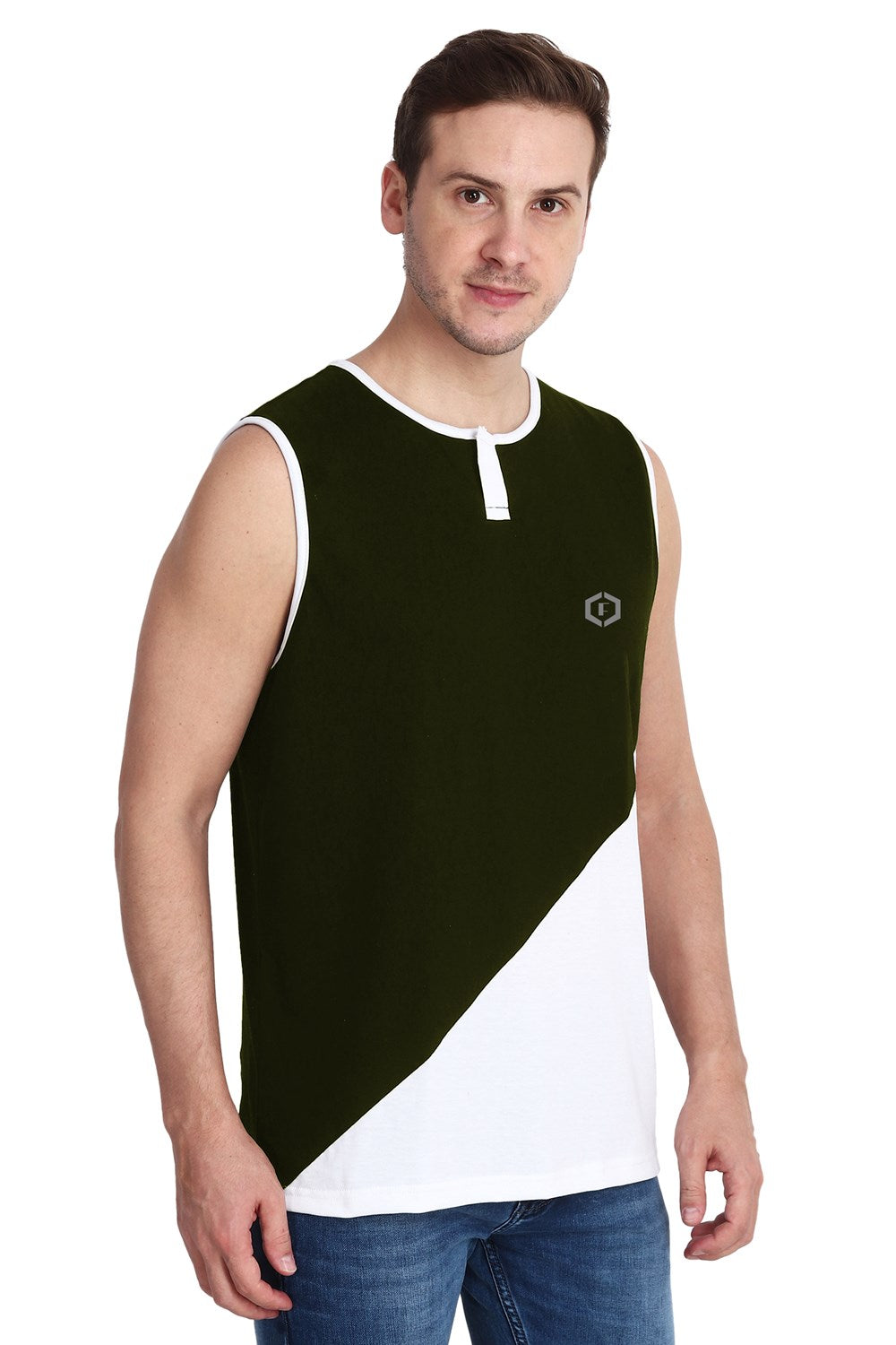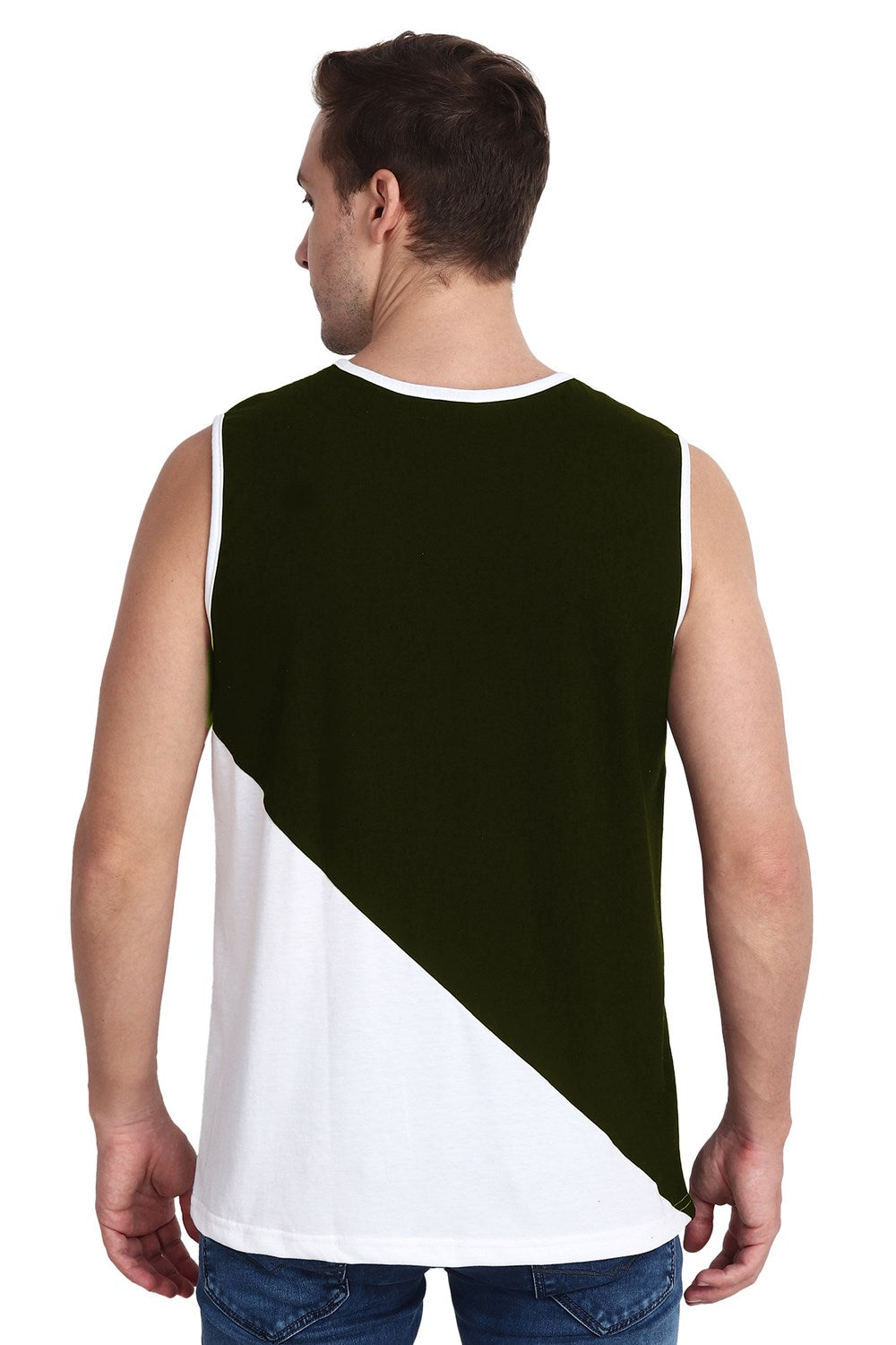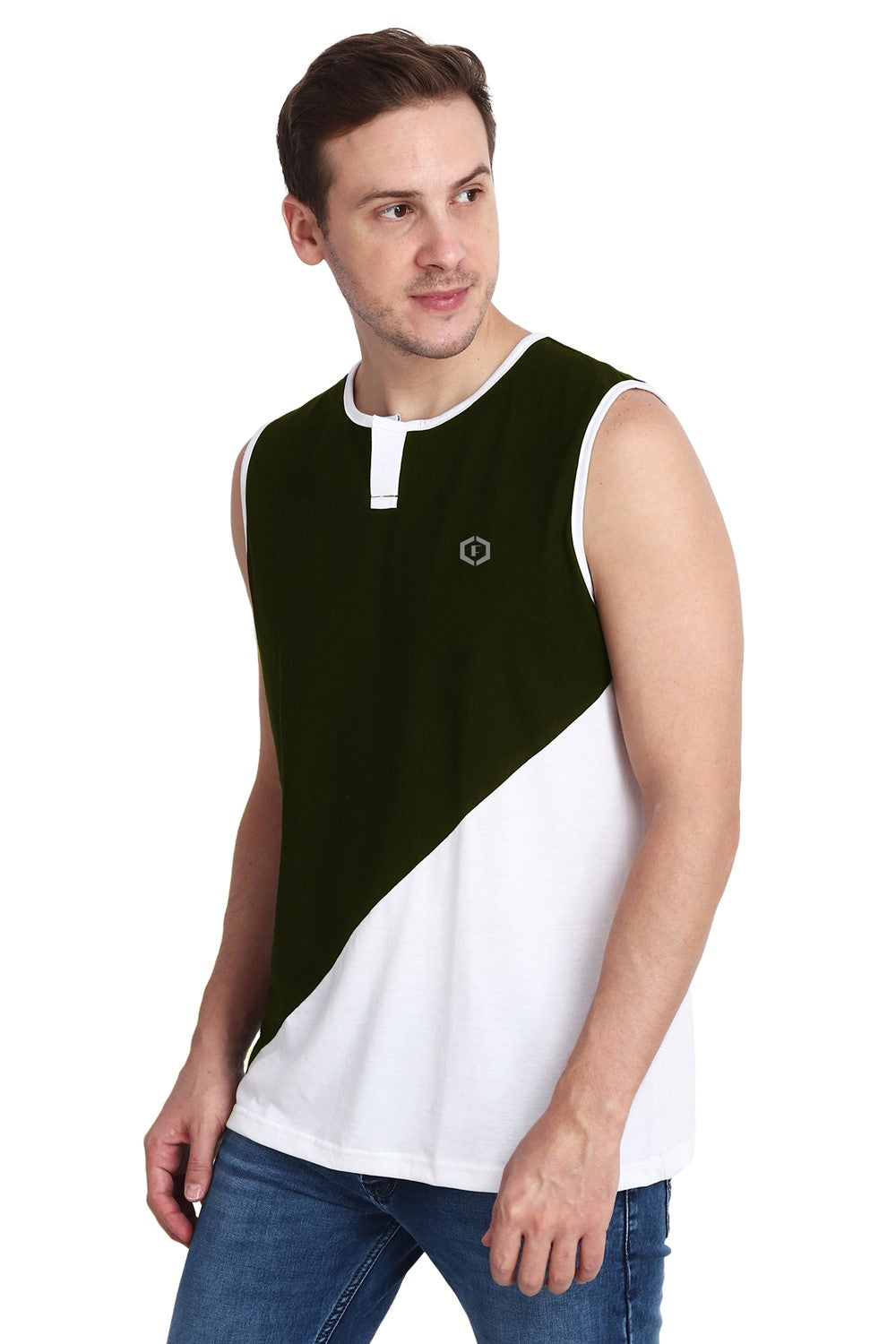 Mens Color-blocked Neck Slit Vest Slant Top Tank - Olive White