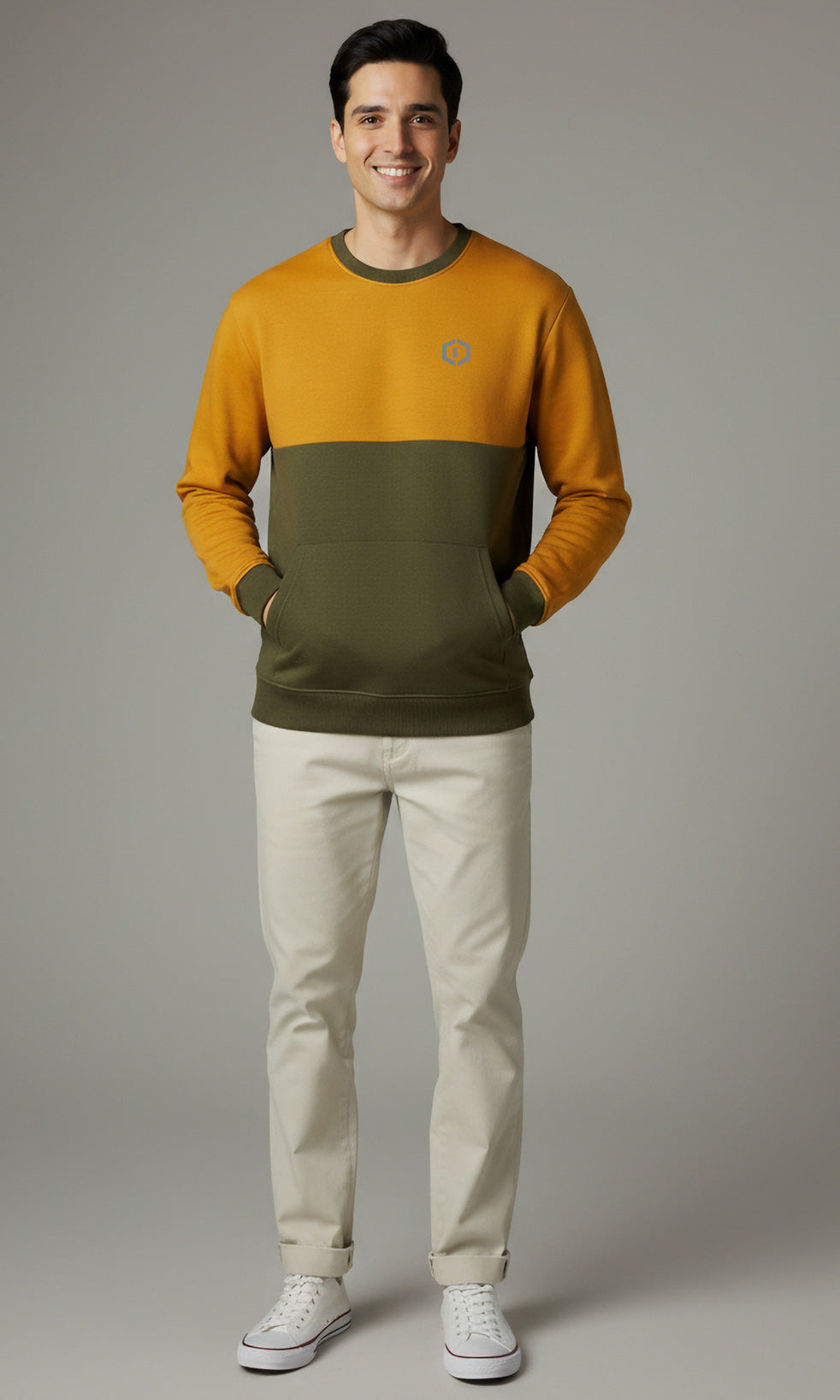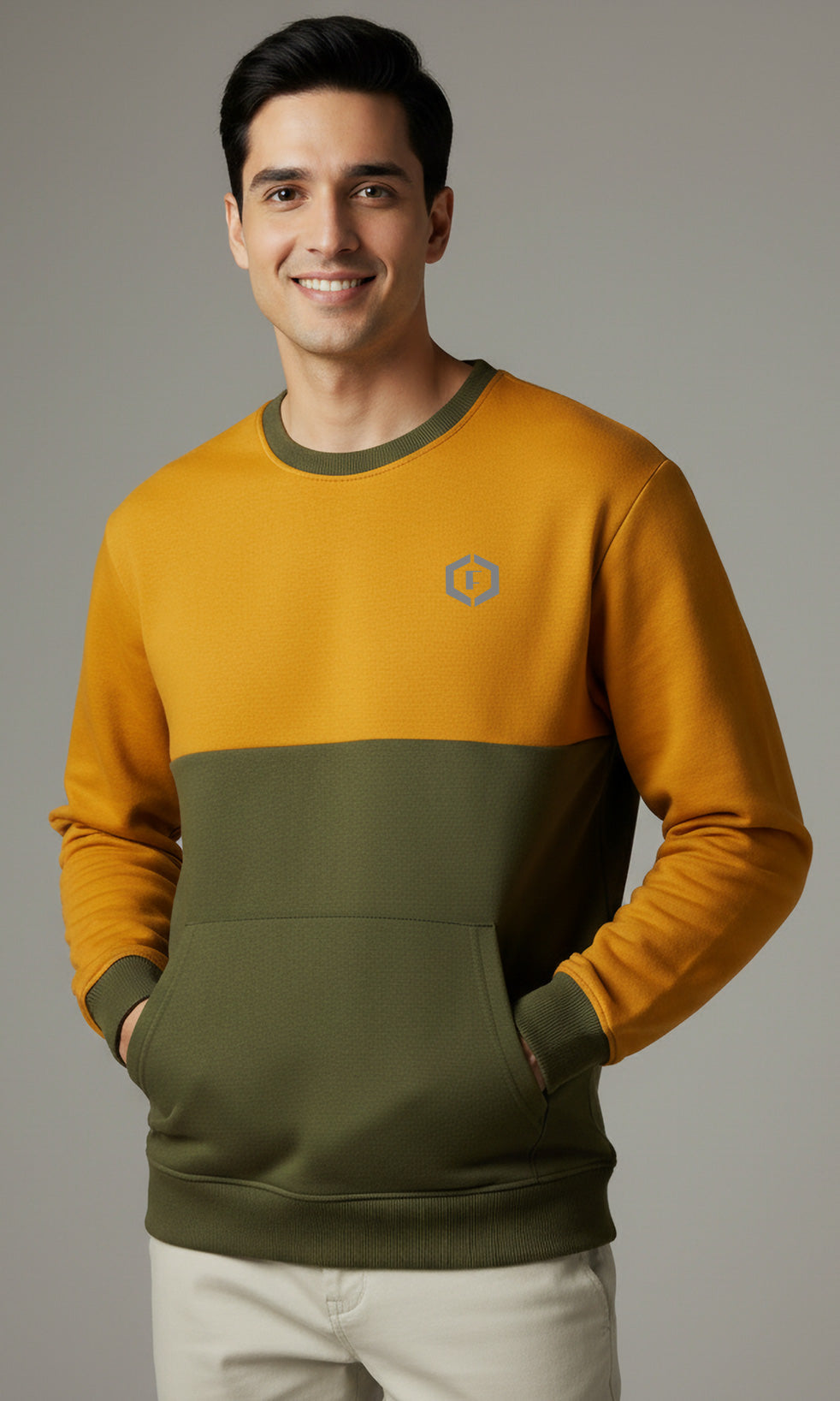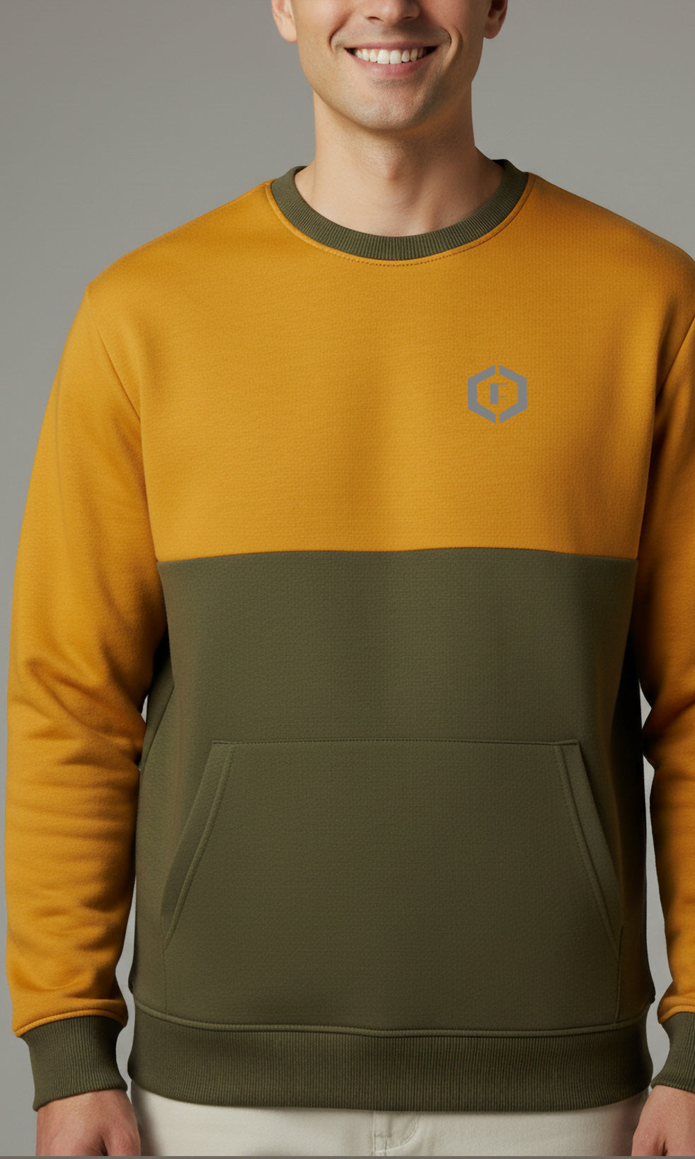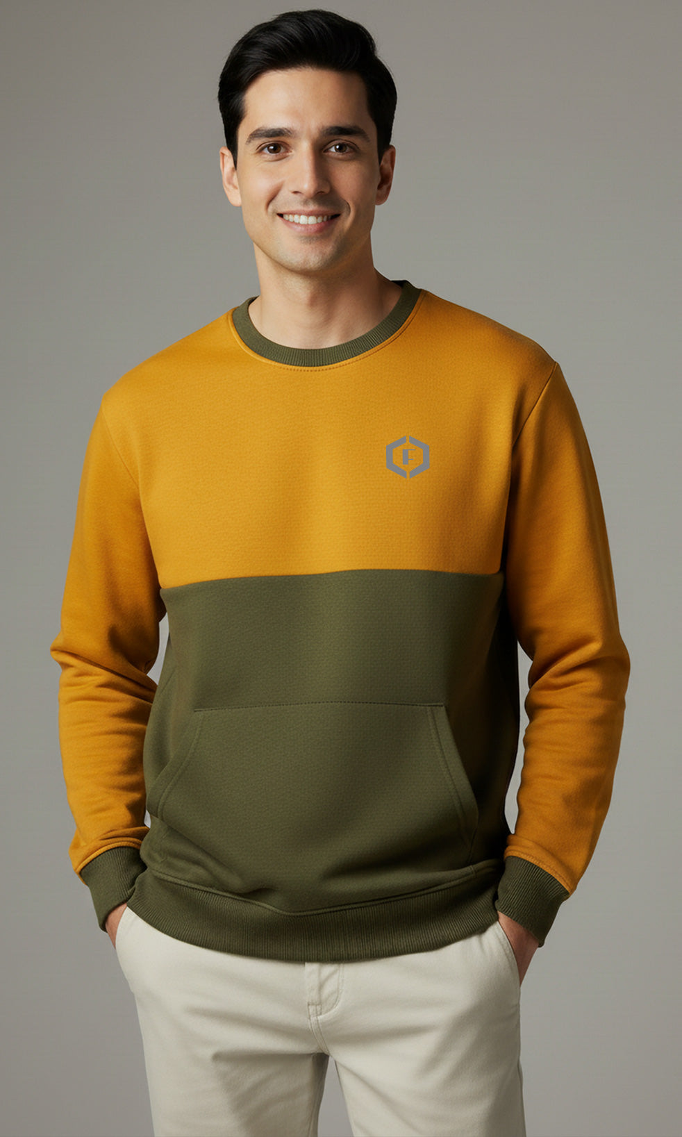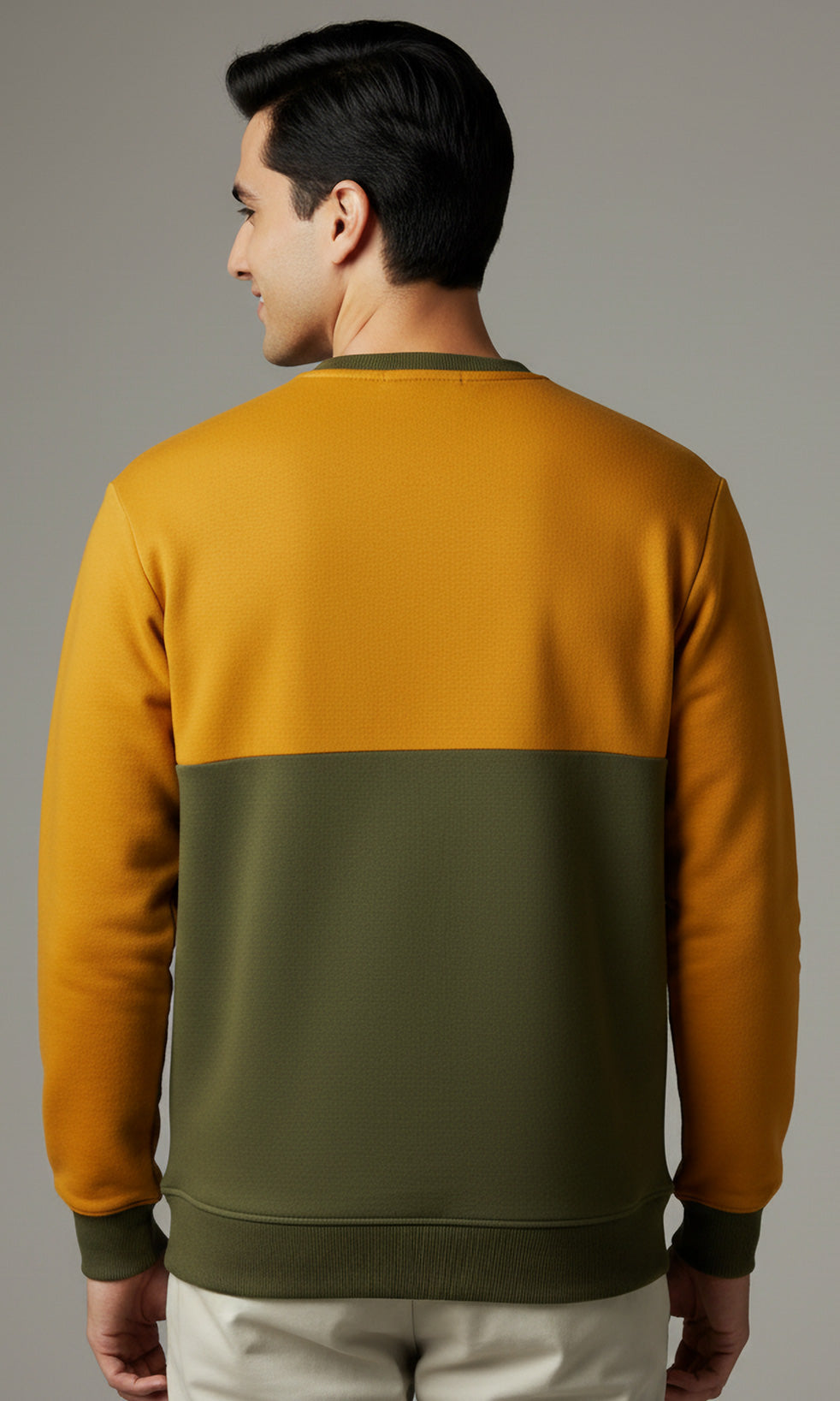 Solid Cotton Blend Mens Relaxed Fit Colorblock Sweatshirt- Mustard & Olive